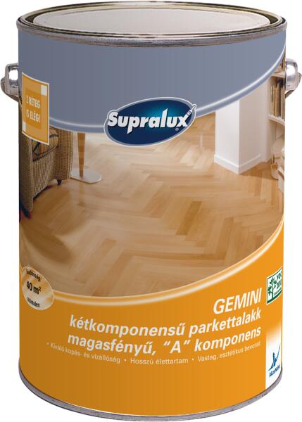 Poliuretán alapú, oldószert tartalmazó, kétkomponensű, színtelen, magasfényű parkettalakk. Új, valamint már használt parketta- illetve fafelületek bevonására és egyéb beltéri fafelületekhez használható. Kopásnak és háztartási vegyszereknek ellenálló lakkbevonatot képez. Az „A” komponensek edénymérete úgy van tervezve, hogy a keverési aránynak megfelelő „B” komponens hozzákeverve beleférjen. - Keverési térfogat arány: 3 rész „A” komponenshez 1 rész „B” komponens - Felhasználhatóság: összekeverés után 6 órán belül - Alapozó: Supralux Gemini Tivinil parketta alapozó - Hígítás: Hígítani nem kell, szükség esetén kizárólag Supralux Gemini hígítóval - Száradási idő 20 C-on: porszáraz 3 óra / teljesen száraz 16 óra - Átfesthetőség: önmagával: parkettán 16 óra után, fatárgyaknál 6-8 óra múlva - Felhordási módok: ecsetelés, hengerezés - Igénybevétel: átkeményedés után (1-2 nap), nagy igénybevétel esetén (pl. iskola, tornaterem) legalább 15 nap múlva - Kiadósság: kb. 10 m2/liter rétegenként. Függ a felület minőségétől és a felhordás módjától - Minőségmegőrzési idő: „A” komponens 60 hónap / „B” komponens 24 hónap