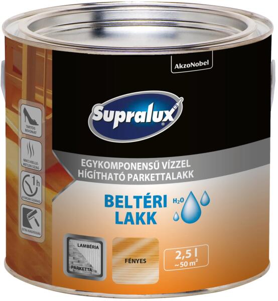 A Supralux beltéri lakk egy vízzel hígítható, egykomponensű, környezetkímélő lakk parketta, hajópadló, lépcső, kezeletlen parafa és egyéb beltéri falfelületek bevonására. Megőrzi a fa természetes színét. Normál és erős igénybevételnek kitett felületekre. Kopásálló, a háztartásban előforduló vegyi anyagoknak ellenálló felületet ad.