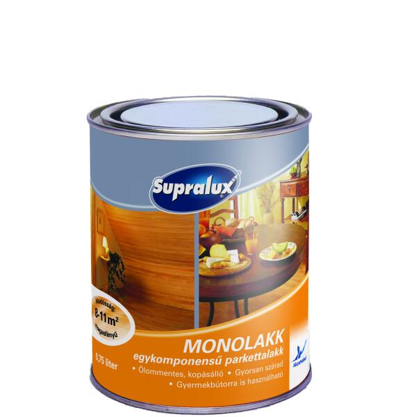 Kopásnak és háztartási vegyszereknek ellenálló, egykomponensű, színtelen parkettalakk. Új, valamint már használt parketta-, ill. fafelületek bevonására egyaránt használható. Bevonata kopásálló, de nagy igénybevételnek kitett helyeken a Supralux Gemini kétkomponensű parkettalakk használata célszerűbb. Használható parketta, és egyéb keményfa felületekhez (székek, íróasztalok, iskolabútorok, gyermekbútorok, tornaszerek, és hasonlók) továbbá puhafa felületekhez (hajópadlók, lambériák, nyílászárók). Poliuretán műgyantát, adalékokat, oldószert tartalmaz. - Alapozó: Supralux Gemini Tivinil parketta alapozó - Hígítás: Supralux H-100 Szintetikus hígító vagy Supralux Lakkbenzin, a termék alkalmazásra kész, hígítást általában nem igényel - Száradási idő 20 C-on: porszáraz, ragadásmentes kb. 1 óra /teljesen száraz kb. 3-4 óra - Átfesthetőség: önmagával: legalább 5 óra után - Felhordási módok: ecsetelés, hengerezés, kefe - Igénybevétel: A lakk átkeményedése után (kb. 2 nap) ill. nagy igénybevételnél (tornaterem, táncterem) 15 nap múlva - Kiadósság: kb. 10 m2/liter rétegenként. Függ a felület minőségétől és a felhordás módjától